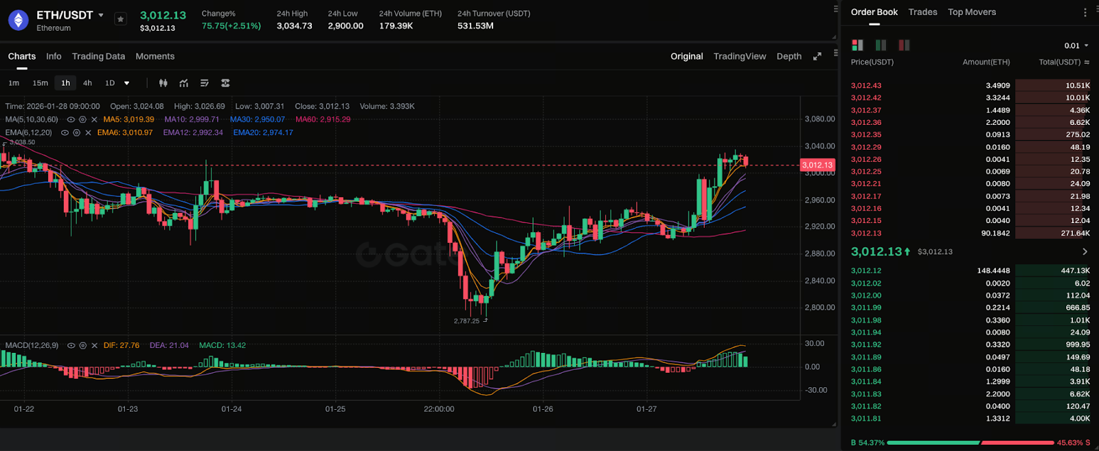 As of January 28, 2026, Ethereum (ETH) has rebounded above $3,000. Recent price action demonstrates that ETH has repeatedly validated support at the $2,900 level and is now attempting to break through higher resistance zones.