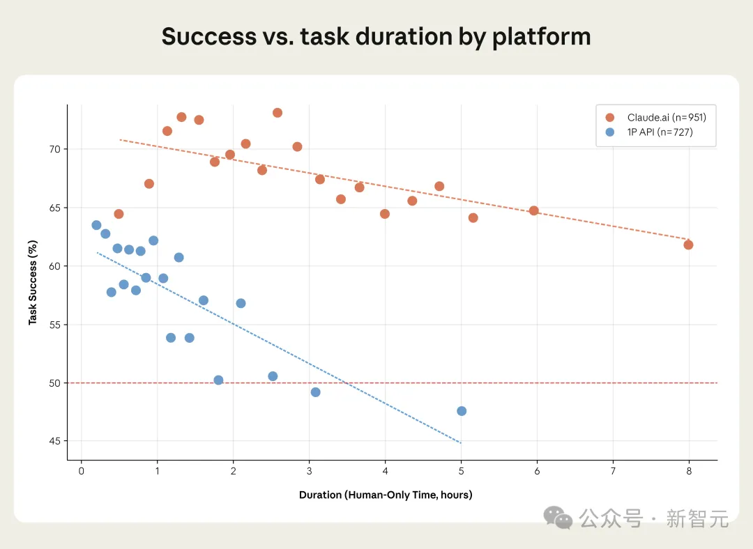 In commercial API scenarios, Claude maintains a greater-than-half success rate on tasks requiring 3.5 hours of work.