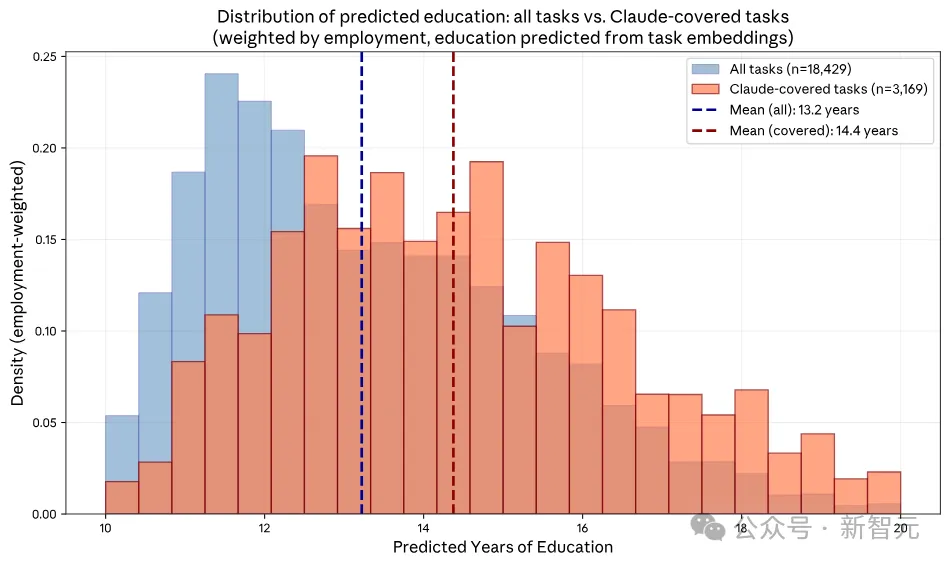 Data shows that the tasks Claude currently covers require an average of 14.4 years of education (comparable to an associate degree), well above the economic average of 13.2 years.