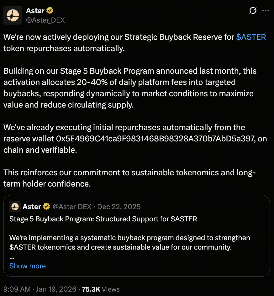 Aster’s Strategic Buyback Reserve is not just a bullish market narrative, but a systematic arrangement that closely links platform revenue, token supply and demand, and long-term development. With its integrated layout across perpetual contracts, spot trading, and cross-chain functionality, Aster is working to build a transparent, predictable, and resilient on-chain trading ecosystem. As DeFi continues to mature and institutionalize, such fundamentals-driven token value models may become a defining factor in the next wave of Perp DEX competition.