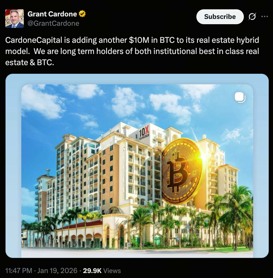 Cardone Capital is increasing its Bitcoin holdings once again, demonstrating strong confidence in its long-term strategy of combining physical and digital assets. By supporting BTC allocation with steady real estate cash flow, the company aims to balance inflation protection, volatility resistance, and long-term value growth. This hybrid asset model provides traditional real estate investors with a new way to incorporate crypto assets into their portfolios.