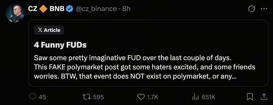 Addressing a widely circulated rumor about a Polymarket prediction event, CZ made it clear that no such event exists. There is no record of this project on Polymarket or any prediction market platform, and a $7 million trading volume is simply impossible. CZ even joked that if the event were real, he would gladly own up to it and might celebrate in creative ways—maybe even wear a hard hat for his next selfie.