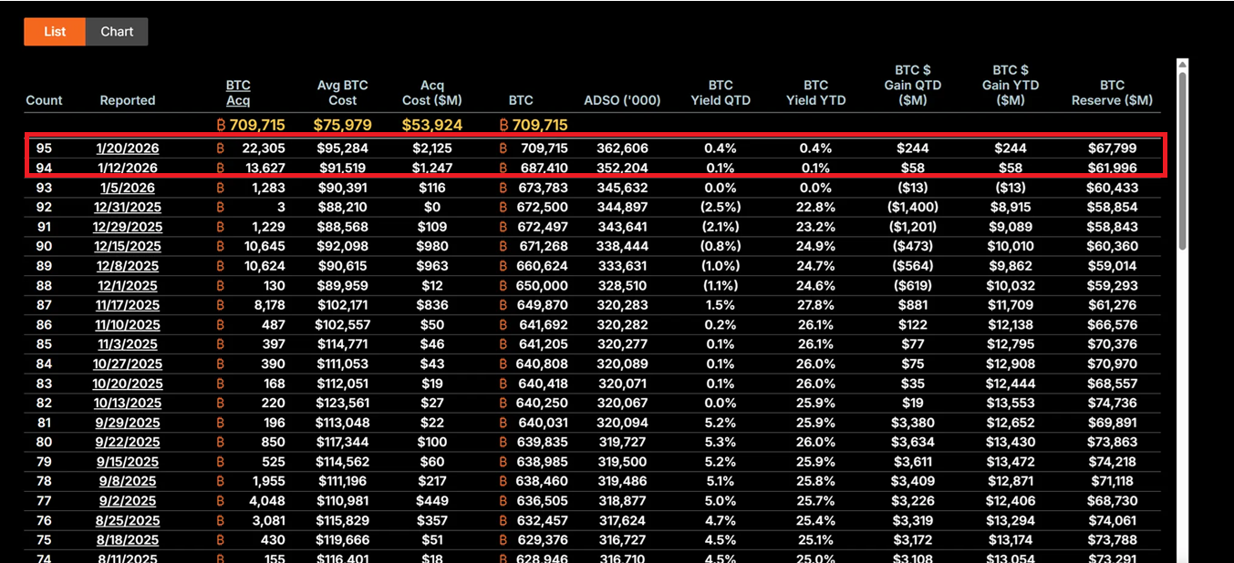 Under CEO Michael Saylor, Strategy has fully transformed into a Bitcoin holding vehicle. From January 12–19, 2026, the company acquired 22,305 BTC at an average price of approximately $95,500, totaling $2.13 billion—the largest single purchase in the past nine months. MSTR now holds 709,715 BTC, with an average cost of $75,979 and a total investment approaching $53.92 billion.