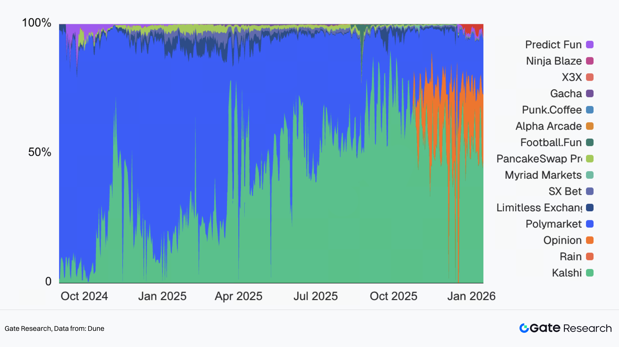 In terms of trading volume market share, Kalshi has achieved a rapid leap from low visibility to a dominant position in just over a year. From being a relatively lesser-known participant during the 2024 election window, Kalshi has grown to hold more than half of the total trading volume in the prediction market sector, even as the number of market participants has become more diverse.
