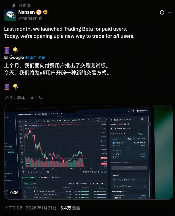 As of January 21, 2026, Nansen has officially rolled out its integrated AI trading tool. Users can now generate and execute trades directly within Nansen, without having to switch to external DEXs or trading platforms.