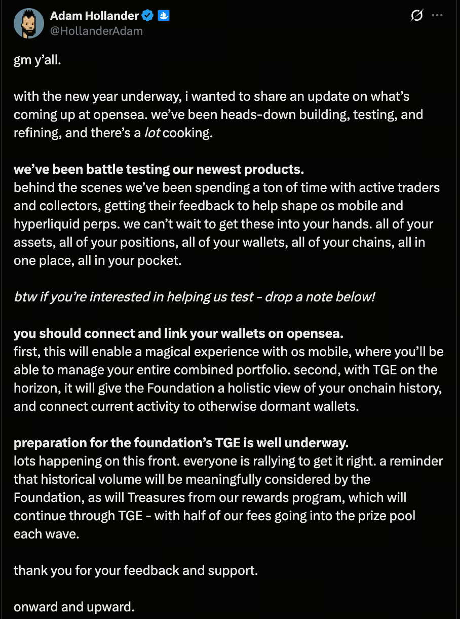OpenSea’s Chief Marketing Officer (CMO) has provided additional details on the SEA token TGE and airdrop. He emphasized that this event is not just an ordinary TGE, but a true Token Generation Event, underscoring the team’s commitment to token quality and long-term value.