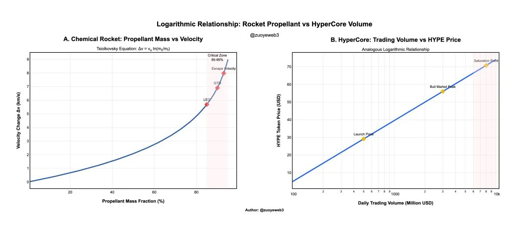 Rocket fuel and thrust are logarithmically related, just as HyperCore trading volume and HYPE price are.