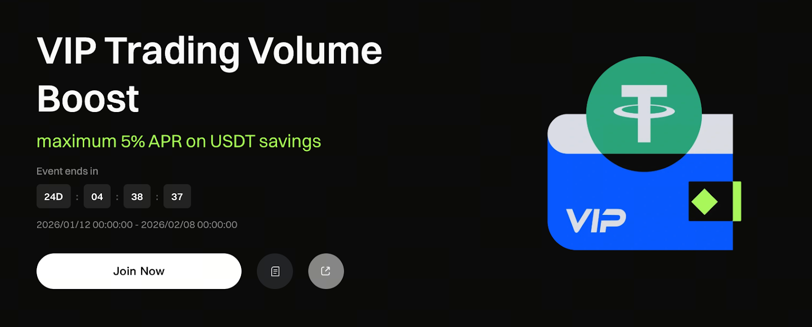 Users who reach VIP5 or higher for the first time during the promotion can receive an additional 0.5% USDT yield boost. If they also complete the trading volume requirement, the yield boost can be stacked, with the total USDT APR reaching up to 5%. This means VIP status not only lowers trading costs, but also continually enhances capital efficiency on the financial side.