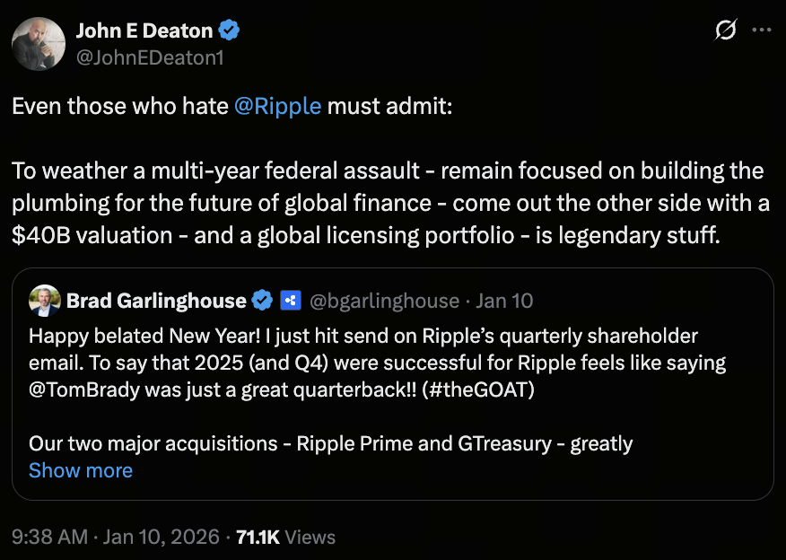 After five years of regulatory headwinds, Ripple has continued to show exceptional resilience and a clear long-term strategy. John Deaton, legal counsel for XRP holders, expressed strong admiration for Ripple’s achievements in 2025, noting that even critics must recognize the company’s outstanding results amid challenging circumstances.